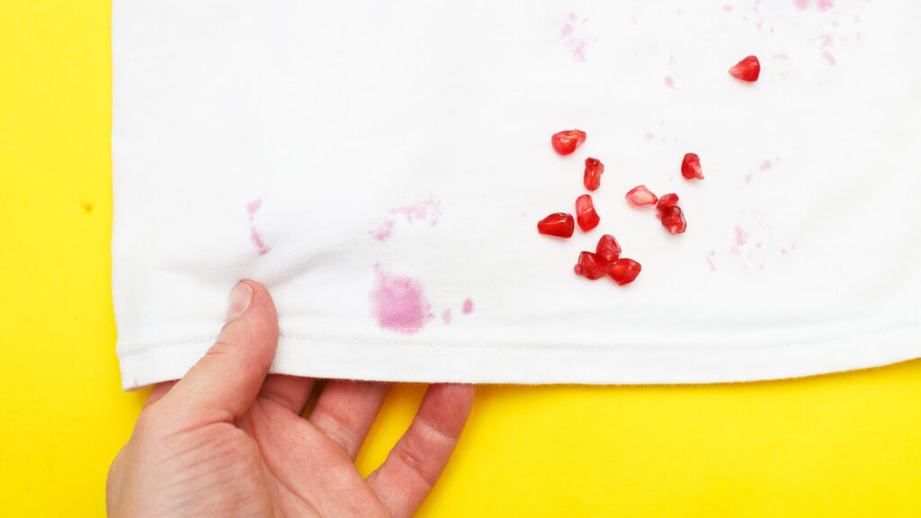 Retira el exceso de fruta de la mancha y deja correr agua fría sobre ella. Lava con detergente, según el cuidado requerido.